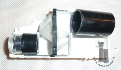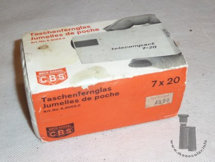 | Das schachtelförmiges Plastik-Monokular von CBS Beck Kassel mit optischer Spezifikation 7x20 hat ein Porro-1-Prismen-System mit simpler Fokussierungmechanik anhand eines geriffelten Schiebeknopfes, der am Objektivtubus eingreift und im Inneren das Objektivsystem bewegt (s. Foto des geöffneten Gehäuses). In seiner Art schon für die Zeit der Herstellung ca. 1960er ein ungewöhnliches Produkt, aber mit ca. 60g sehr leicht und mit 82x44x23mm handlich und aufgrund des benutzten Materials recht kostengünstig. | The box-shaped plastic monocular by CBS Beck Kassel with its specifications of 7x20 has a Porro I prism system and a simple focusing mechanism, that is a grooved slider connecting to the objective tube and moving the objective system inside (see photo of the open housing). It is an unusual design for its production time in the 1960s. With a weight of only 60g and dimensions of 82x44x23mm, it was very handy and due to the used material quite low-priced. |