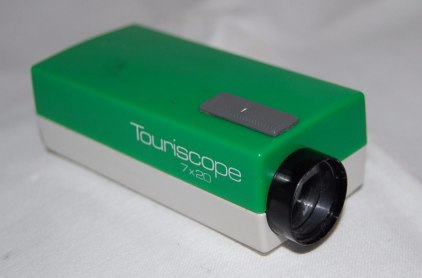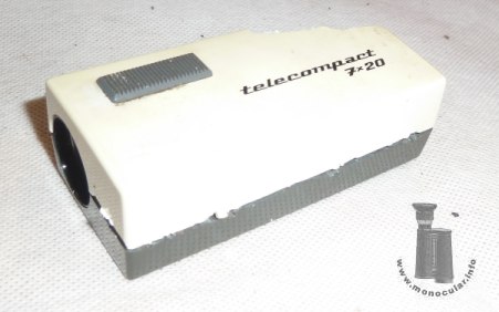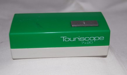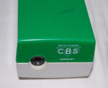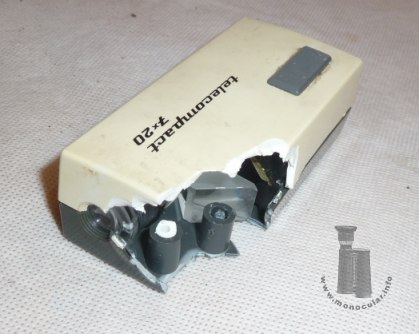 | Das creme- oder elfenbein- und dunkelgrau farbige Exemplar mit Modellnamen "Telecompact" ist leider an einer Ecke stark beschädigt, erlaubt aber dadurch einen Einblick in die Konstruktion. Das oragne/hellrote und das grün- und graufarbige Exemplar trägt jeweils den Modellnamen "Touriscope". Ein anderes Modell ist blau.Die Namen deuten die von Beck beabsichtige Verwendungsbereich an: als handliches Taschenfernglas (s. Verpackungsbeschriftung) und zum leichten Mitnehmen auf Reisen oder Touren. Auf der Okularseite ist das Mookular mit "Beck Kassel", dem CBS-Logo und "Germany" beschriftet. | The cream or ivory and dark grey coloured model with the model name "Telecompact" unfortunately is severly damaged on one corner, but thus allows an insight into the construction. The light red/orange and the green and grey model each is labeled "Touriscope". Another blue specimen is known. Both names hint at the intended field of use, i.e. a compact and handy pocket monocular (cf. box inscriptions) to take with you for traveling and touring. The monocular is marked with "Beck Kassel", the CBS logo and "Germany". |