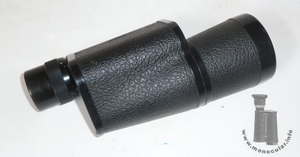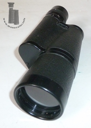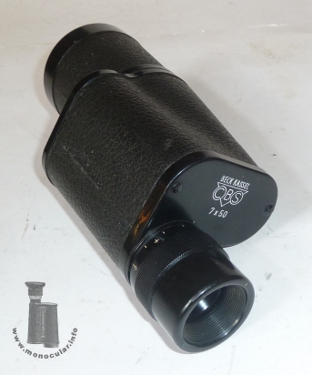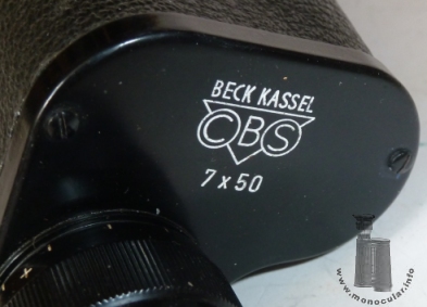 | Das 7x50 Modell von Beck ist ein typisches Porro-1-Monokular mit konischem Objektivtubus. Es hat eine Kunstlederummatnelung, eine eingegossene Trageriemenöse und eine Plastikaugenmzuschel sowie eine umlaufende, aber unbeschriftete Dioptrienskala am linksseitigen Okularstück. Die schwarz lackierten Deckel sind oben zweifach und unten einfach verschraubt. Der obere Deckel ist mit "Beck Kassel CBS 7x50" beschriftet. Die Optik ist violett-blau vergütet. | The 7x50 model by Beck is a typical porro 1 prism monocular with a conical obejctive tube. It comes with a leahtrette covering, a cast-in strap lug, and a plastic eyecup as well as a full but unnumbered dioptre scale on its left-hand sided eyepeice. The black lacquered cover plates have two screws on the top and one screw on the bottom. The upper cover is inscribed "Beck Kassel CBS 7x50". |