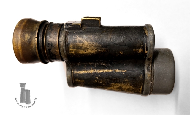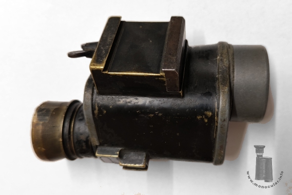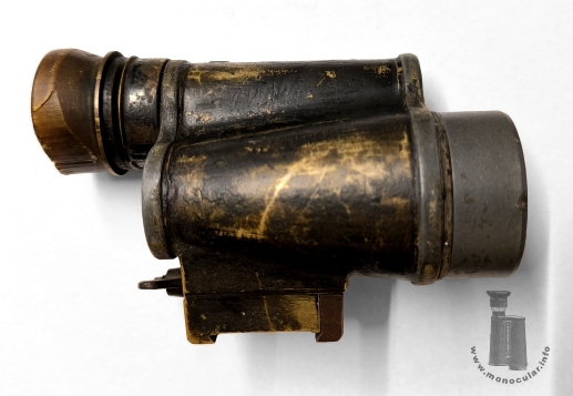Here is a rare monocular version of the D.F. 6x42 from Zeiss, which was made in the Vienna branch as a military sight for use with another device, such as a rangefinder or flak. In addition to the Carl Zeiss Vienna lens logo, the upper cover plate is amrkede with "M.15.Z. Visierfernrohr no.48" (telescopic sight) and the data 6x and 8.4 °; the lower cover plate bears the acceptance stamp "UK 20.12.1917", which clearly denotes it as glass from WWI. The telescopic sight is made of aluminum with an anthracite-colored paint on the body and a hard rubber eyecup. There is a mounting foot with fastening grooves and a wing screw. A red glass window and attachment for a lighting unit is to the right of the eyepiece. the reticle has a crosshair. The optics are uncoated. |