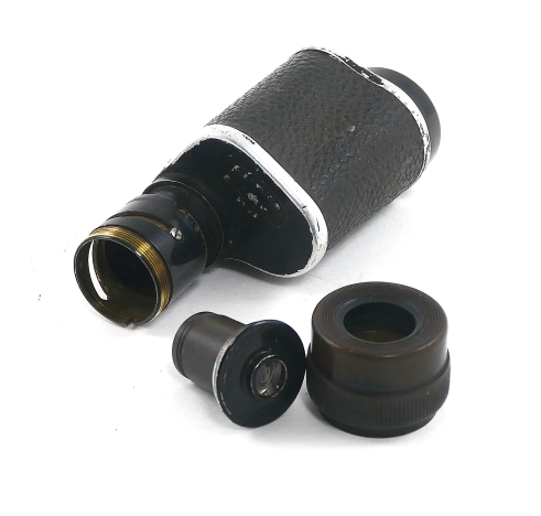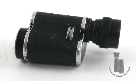 | Das Deraisme 8x25 Monokular ist mit dem Logo und 8x25 auf dem obeen schwarz lackierten Aluminiumdeckel beschriftet. Die Deckel haben keine Schrauben. Der obere Deckel wird jedoch mit einem Schraubring am Okularstück fesgezurrt. Die 2/3 Augenmuschel am linksseitigen Okularstück mit einer umlaufenden Dioptrienskala ist aus Kunststoff. Das Oularstück und die Objektivfassugn sind aus Messing. Wei bei an deren französischen Gläsern lässt sich das Okularlisnenhülse herausziehen, wenn man die augenmuschel abschruabt. Das Gehäuse ist mit strukturiertem Hartgummi ummantelt. Am Korpus ist eine gebogene Trageriemenöse eingegossen. | The Deraisme 8x25 monocular is marked with the company logo and 8x25 on the black painted top cover plate. The aluminium covers have no screws, but the top cover is fixed by a retainer ring on the eyepiece. The 2/3 eyecup on the left-hand sided eyepiece is made of plastic. The eyepiece and the objective frame are made of brass. The dioptre scale is running completely around the eyepiece. Like with other French made glasses you can pull out the ocular lens casing when screwing off the eyecup. The housing is covered with a textured hard rubber. There is a bowed cast-in strap-lug. |