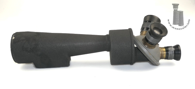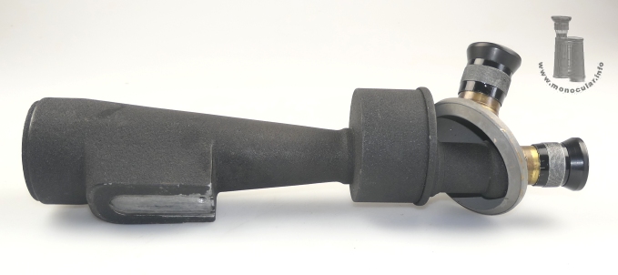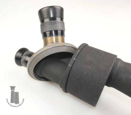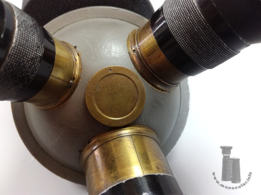 The Fournier Type V prism telescope has a three-magnification eyepiece turret: 14x, 21x, and 28x. The inscription disc in the center of the turret is engraved with the company logo "G. Fournier Paris V - 39" and the magnification settings near the eyepieces. The objective lens has a 50mm diameter. The eyepieces feature a full-circumference diopter scale, marked at zero and five at both plus and minus. The conical objective tube with its cast-in prism housing (Porro II prisms), the five-screwed housing cover, and the eyepiece tube are coated with an anthracite-coloured textured lacquer. The brass eyepiece turret is painted grey, the metal parts of the eyepieces are black, except for the once screw-secured eyepiece sleeves, which are unpainted. The objective tube uses a dovetail mount. The attachable sunshade is missing (cf. Pietrini: Le Grande Guerre des Jumelles, vol. II, p. 266) and there is no reticle. |