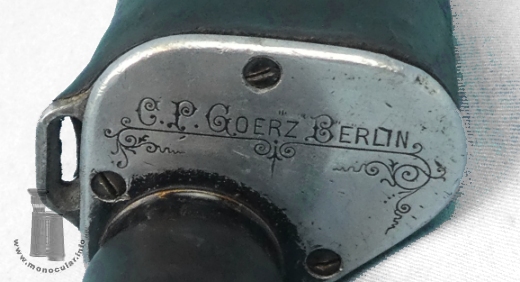 | Das abgebildete Monokular hat die Firmenbezeichnung "C. P. Goerz Berlin" in floraler Jugendstil-Schrift am oberen Deckel und die Seriennummer 53960 - 1903/04 - am unteren Deckel (beide 3fach verschraubt). Die Lederummantelung ist mit "12x" gestempelt, so dass es sich um ein 12x20 (tatsächlich 12x21) Glas handelt. Es wiegt 204g. Das Prismengehäuse ist 4,5 x 4,5 x 9,2cm groß bei einer Gesamtlänge von ca. 126 - 134 mm. Das Gehäuse ist dreieckig geschnitten, hat eine eingegossene Riemenöse und eine Bakelitaugenmuschel mit unbeschriftete Dioptrienskala (+/-2). Ein weiteres Exemplar mit Seriennummer 143602 - ca. 1908 - und Druckschrift am oberen Deckel hat nunmehr Messingdeckel und wiegt 252g. Der zugehörige Köcher trägt die Initialien eines britischen Offiziers ("Capt. A.J.H. Iles B.A.M.C."). |