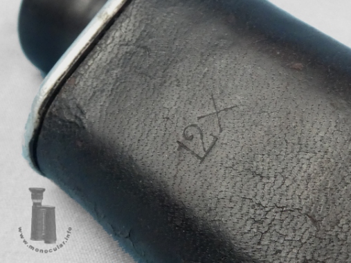 The monocular shown here is marked with the company's name "C. P. Goerz Berlin" in a floral Art Noveau script at the top cover, and with its serial number 53960 - 1903/04 - at the bottom cover (both fixed with 3 screws). The leather covering is stamped with "12x", so this is a 12x20 (actually a 12x21) glass weighing 204g. The prism housing measures 4.5 x 4.5 x 9.2cm – overall length is 126 - 134 mm. The design of the body is triangular. It has a cast-in strap lug and there is a Bakelite eye-cup with a dioptre scale (+/-2) without numbers. Another specimen with the serial number 143602 - c. 1908 - and block letters on the top cover now comes with brass cover plates and weighs 252g. Its matching case is marked with some British officer's initials ("Capt. A.J.H. Iles B.A.M.C."). |