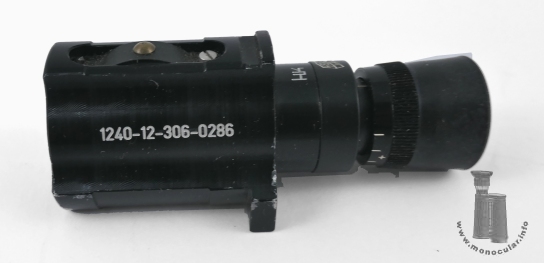 This monocular in a mount frame is likely identical to the Zeiss (Oberkochen) 6x20B with a rubber eyecup. It was built by Hensoldt Wetzlar (Zeiss Group, military production from the 1960s to approximately 2000s) for Heckler & Koch (HK). The initials HK are engraved on the tube, and the Hensoldt Wetzlar prism logo and the serial number 134564 are located on the metal ring screwed onto the main tube. Die Montagefassung trägt die Nummer 1240-12-306-0286 und hat eine Federarretierung. The monocular has a Schmidt-Pechan prism system and a blue-violet coating. It has a fold-back rubber eyecup and a diopter adjustment from plus to minus 3, marked only with + and -, as well as a triangle for the zero setting. The serial number is 134564; Another example without a mount has the number 134712. The mount comes with number 1240-12-306-0286 and a spring lock. The monocular was probably manufactured as a riflescope, sighting device, or other testing device which is also indicated by having a cross-wires reticle. |