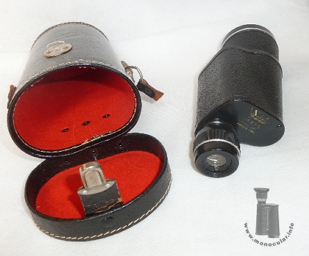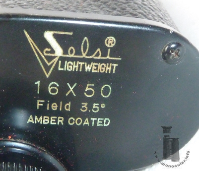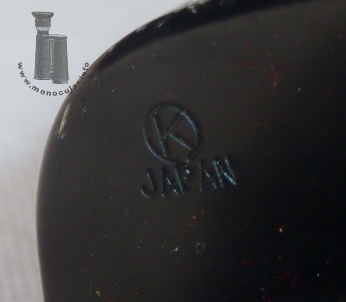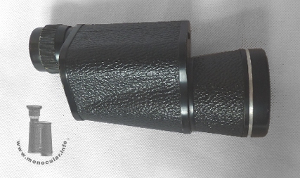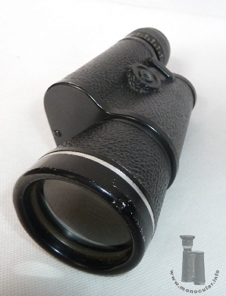 | Das vorliegende Selsi Porro-1-Prismen-Monokular hat ein recht hohe Vergrößerung von 16fach und ist daher für ein ruhigeres Halten mit einem eingegossenen Stativgewindeadapter ausgestattet. Das linksseitige Okular hat oben am Fokussierungsring und am Ende des konischen Objektivtubuses einen blanken silber-farbigen Zierring. Die Optik ist vergütet und weist den typisch gelb-orangen Schimmer auf, welcher auf dem einfach verschraubten oberen Deckel als "AMBER COATED" bezeichnet wird. Darüber hinaus gibt es die Kennzeichnung mit dem Selsi-Schriftzug, den optischen Daten 16x50 sowie dem Sehfeld von 3,5°. Der untere Deckel ist mit einem K im Kreis und "Japan" markiert, also Nachweis einer Fertigung in Japan durch eine Firma mit Buchstaben K am Anfang des Namens. Das Aluminiumgehäuse hat eine Hartgummiummantelung und eingegossene Trageriemenöse. Die anderen Metallteile sind schwarz lackiert. Die Augenmuschel ist aus Kunststoff. Die Dioptrienskala reicht von plus bis minus Vier. | The Selsi Porro 1 prism monocular here comes with a rather high magnification of 16 times so that is also has a tripod thread for shake-free observation. The left-hand sided eyepiece has silvery decoration rings at the top of the focusing part and at the end of the conical objective tube. The optics are coated. They have a yellowish-orange tint which is typical of the Selsi brand. This is denoted by "AMBER COATED" on the top cover plate. Moreover, it is marked with the Selsi script, optical data, 16x50, including field of view, i.e. "3.5°". The bottom cover is marked K within a circle and "Japan", the latter as a proof of a production in Japan by some company starting with a K in its name. Both cover plates have only one screw. The aluminium body is covered with Ebonite and has a cast-in strap-lug. The other metal parts are lacquered black. The eyecup is made of plastic. The dioptre scale ranges from plus to minus four. |