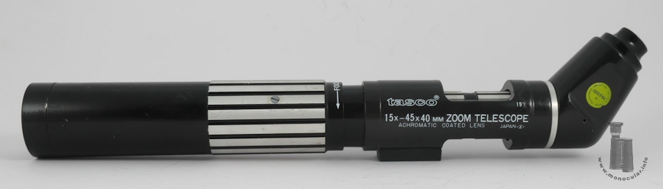 | Dieses Zoomteleskop des Vertreibers TASCO (Tanross Supply Company) wurde laut Beschriftung und Prüfaufkleber des "Japan Telescope Inspection Institute" in Japan hergestellt. Die Herstellermarke mit Z in einer Raute ist mir unbekannt. Die japanischen Herstellerkürzel (JE/B) sind nicht vorhanden. Das sich verjüngende 45° angewinkelte Okulargehäuse lässt sich auch um 45° nach links und rechts schwenken, um den Einblick von unterschiedlichen Positionen zu ermöglichen. Vor dem Okular nach einem Zierring schließt sich der Tubus mit Zoom-System an. Der Zoom lässt sich mit einer geriffelten Walze in Aussparungen oben und unten einstellen. Diese ist mit "45x ← ZOOM → 15x" beschriftet. Beide Tubusseiten sind mit "tasco® 19T 15x - 45x 40 MM ZOOM TELESCOPE Achromatic coated lens Japan" gekennzeichnet. "19T" dürfte die Modellnummer darstellen. Unten am Tubus ist ein Standard-Stativadapter angeschraubt. Der längere Objektivtubus lässt sich zum Fokussieren drehen. Er ist mit "← FOCUS →" beschriftet. | This zoom telescope from distributor TASCO (Tanross Supply Company) was manufactured in Japan, according to the label and the inspection sticker from the Japan Telescope Inspection Institute. The maker's mark, which has a diamond-shaped Z, is unknown to me. The Japanese manufacturer's initials (JE/B) are missing. The tapered 45° angled eyepiece housing can also be swiveled 45° left and right to allow viewing from different positions. The tube with the zoom system is located in front of the eyepiece after a decorative ring. The zoom can be adjusted using a knurled roller in recesses at the top and bottom. This is labeled "45x ← ZOOM → 15x." Both sides of the tube are marked "tasco® 19T 15x - 45x 40 MM ZOOM TELESCOPE Achromatic coated lens Japan." "19T" is likely the model number. A standard tripod adapter is screwed onto the bottom of the tube. The rather long objective tube can be rotated for focusing. It is labeled "← FOCUS →". |