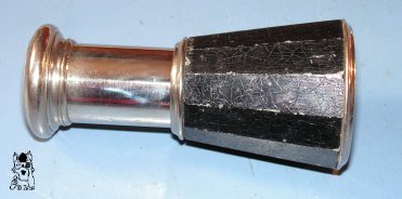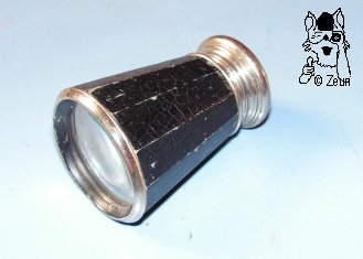This Galilean monocular with a draw tube is marked "Adens Monox Japan" at its eyecup- I assume it was made during early post-war times of occupied Japan. The glass ha a zththree or three and a half times magnification and a 40mm objective lens. The parts are made of iron/zinc with a silvery polished finish. The dodecahedral conical shaped tube is covered with a black crinkle paint. The monocular is 75mm closed, and 108mm extended. The objective frame is 53mm, the draw tube 25mm, and the eyecup 40mm in diameter. The "Monox" weighs 135g. |