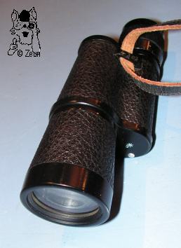 This is a blue coated 10x35 monocular with cover plate markings "Army & Navy Stores Ltd. 1871" in an oval including two soldiers with signal flags - probably a seaman and a foot soldier each - as well as to the right of it a "10x35" specification. The single screw lower cover plate is marked with a sun symbol havin an "F" at one ray, an emblem shown on every glass made by "Aquilius". The cover rim is inscribed "Made in France" which is another hint to that. It could well be a production for the British market. Specifications of this monocular are identical to the Aquilius 10x35, only differing in inscriptions and having a right-hand sided ocular. |
