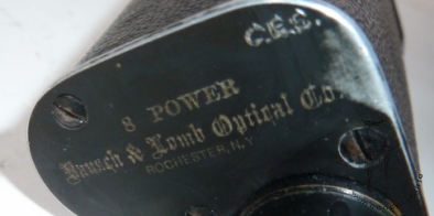 | Ein anderes 8x20 Modell ohne Trageriemenöse ist lediglich mit "8 POWER - Bausch & Lomb - Rochester N.Y." beschriftet. Zusätzlich gibt es eingeritze Gravuren: oben "C.E.S." und unten "SAMPSON CRESTON IOWA", offensichtlich der Besitzername und -adresse. | Another 8x20 model without strap lug is only marked with "8 POWER - Bausch & Lomb - Rochester N.Y.". Additionally there are som scratched engravings: top cover "C.E.S." and bottom cover "SAMPSON CRESTON IOWA", obviously the owner's name and address. |