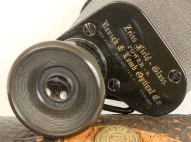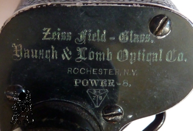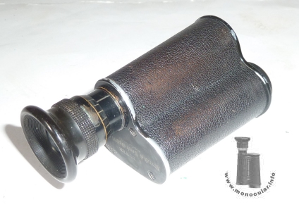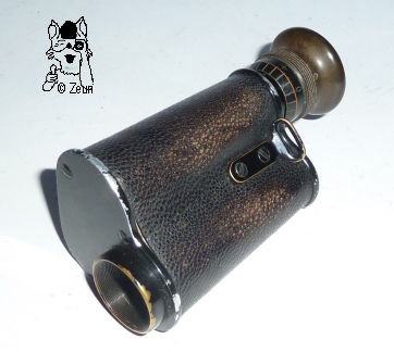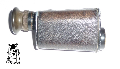 | Hier ist ein monokularer Feldstecher mit 8facher Vergrößerung und einem nach innen versetzten 20er Objektiv als Lizenzfertigung der Zeiss-Feldstecher (Anfang 1900).Auch die Lederköcher sind gleich den damaligen Zeiss-Köchern (der DRuckknopf ist mit Bausch & Lomb" beschriftet). Es handelt sich also um ein 8x20 Modell mit geradem Deckel. Das Monokular ist aus schwarz lackierten dreifach verschraubten Aluminiumdeckeln und -gehäuse mit einer Lederummantelung. Die Trageriemenöse ist an einem angeschraubten Messing-Metallstreifen, welcher ca. 1/3 so lang wie das Gehäuse ist. Die 2/3 Augenmuschel ist aus braunem Bakelit, das linksseitige Okular mit umfaufender Dioptrienskala aus Messing. Der obere Deckel ist in Frakturschrift mit "Zeiss Field-Glass" und "Bausch & Lomb Optical Co." sowie in lateinischer Schrift zwischen den Frakutchriftzeielen mit "POWER - 8." und darunter mit "Rochester, N.Y. Chicago" beschriftet. Bei einem etwas späterem Exemplar folgt den ersten zwei in Fraktur ravierten Zeilen "Rochester N.Y. - POWER - 8". Darunter ist das Logo der "Triple Alliance" mit den Initialien "B-L", "Z" und "S" - daher stammt das zweite Exemplar von ca. 1908/09. Seriennummern sind nicht vorhanden. |