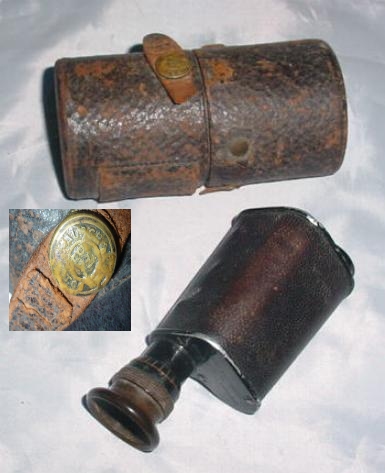 Here is a monocular field-glass with 8 times magnification and a recessed 20mm objective lens. It is a licenced production of an 8x20 Zeiss field-glass with a straight top cover (beg. of 1900). Moreover, the leahter cases are the like the Zeiss ones ( the push button is marked with the B&L name). The monocular is made of black painted aluminium covers with three screws and an aluminium body with a leather covering. The screwed-on strap lug is a brass metal strip which is a third of the housing's length. The 2/3 eyecup is made of brown Bakelite, the left-hand sided ocular has a dioptre scale and is made of brass. The top cover is marked "Zeiss Field-Glass" und "Bausch & Lomb Optical Co." in Gothic script as well as "Rochester, N.Y." inbetween the Gothic lines, followed by "POWER - 8." in Latin. Another somewhat later specimen bears the "Triple Alliance" logo with the initials "B-L", "Z" and "S" below these inscriptions. So, the latter model must date from about 1908/09. There are no serial numbers. |