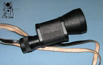 A rather rare Barr and Stroud monocular is the CF53A, which differs from the other models with a porro 2 system or smaller apertures by its porro 1 system with a elongated conical objective tube. The CF53A has a 10 times magnification and a 42mm objective lens. The optics are coated blue. The single screw cover plates are made of Bakelite. So are the objective frame and the eyecup. Both the covers have a lug at their protruding rim. The housing and the objective tube have a textured paint covering. The dioptre adjustment ranges from plus to minus 6, marked with 0, -5 and +5. |