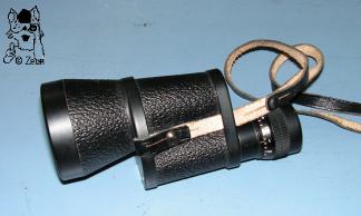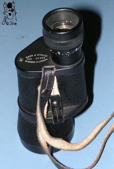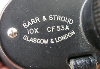 | Ein eher seltenes Barr & Stroud Monocular, das sich durch ein Porro-1-Prismensystem plus verlängertem konischen Objektivtubus von den anderen B&S-Gläseren mit Porro-2-System oder kleinerer Objektivlinse unterscheidet. Das CF53A hat eine 10fache Vergrößerung und ein 42mm Objektiv sowie eine blau vergütete Optik. Die einfach verschraubten Deckel, die äußere Objektivfassung und die Augenmuschel sind aus Bakelit. Beide Deckel haben am überstehenden Teil Schlitze für den Trageriemen. Das Gehäuse und der Objektivtubus haben eine Rauhlackummantelung. Die Dioptrieneinstellung reicht von + bis -6 und ist bei 0, +5 und -5 gekennzeichnet. |