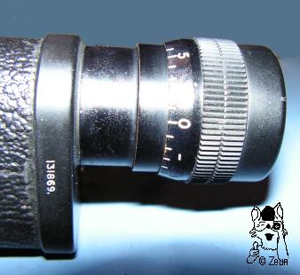 | Die Seriennummer am Rand des oberen Deckels lautet 131869 (rechtsseitiges Okular) und müsste zwischen 1968 und '70 produziert worden sein. Weitere bekannte CF53A Seriennummern sind 120762 and 131872 (pers. Mitteilung v. W. Reid). Ein weiteres CF53A mit linkseitigem Okular hat die Nummer 113214. | The serial number at the rim of the upper cover plate is 131869 (right-hand sided ocular), thus dating from about 1968-70. Other known numbers are 120762 and 131872 (personal correspondence by W. Reid). Another CF53A with a left-hand sided ocular has got number 113214. |