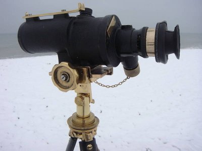 | Ein monokulares Teleskop von Barr & Stroud ist das Modell C.D.54, das mit einer passenden Holzkiste bei Ebay versteigert wurde. Möglicherweise ist es ein umgebautes anderes monokulare B&S-Modell, da auf dem Gehäusedeckel eine Namensplatte angeschraubt ist, aber keine Kennzeichnungen direkt eingraviert sind. Die Messingplatte ist mit "BARR 6 STROUD Ltd. MONOCULAR TELESOPE TYPE C.D.54. No. 4060" beschriftet. Die Transportkiste (Stowage Box) ist passend für das CD54 und mit Nr. 10304 gekennzeichnet. Das Okular enthält ein Fadenkreuz und mittels eines Stellknopfes lassen sich drei Filter wechseln. Es hat auch eine Dioptrienskala von +/5 und rastet beim Drehen leicht ein (click-stop). Außerdem hat es eine Gummiaugenmuschel. Es gibt zwei Trockenluftöffnungen am Teleskop sowie ein zusätzlich angebrachtes Messing-Visier. Das so ausgetattete Teleskop dürfte wohl militärischen Zwecken gedient haben. |