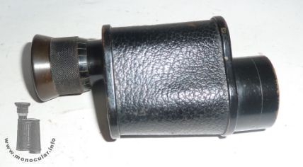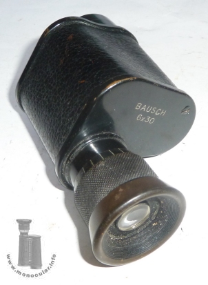 Inwiefern das Monokular in Zusammenhang mit der Firma "Bausch & Lomb" steht, ist ungewiss. Belege für eine andere Firma lassen sich jedoch auch nicht finden. Die Deckel sind schwarz lackiert und einfach verschraubt. Das Gehäuse ist mit Leder ummantelt und hat eine Trageriemenöse. Der utere Deckel hat eine intergrierte Objektivhülse und daran angeschraubte Objektivfassung. Die Bakelit-Augenmuschel ist eher flach und trichterförmig. |