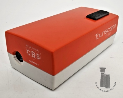 | Das creme- oder elfenbein- und dunkelgrau farbige Exemplar mit Modellnamen "Telecompact" ist leider an einer Ecke stark beschädigt, erlaubt aber dadurch einen Einblick in die Konstruktion. Das oragne/hellrote und das grün- und graufarbige Exemplar trägt jeweils den Modellnamen "Touriscope". Ein anderes Modell ist blau.Die Namen deuten die von Beck beabsichtige Verwendungsbereich an: als handliches Taschenfernglas (s. Verpackungsbeschriftung) und zum leichten Mitnehmen auf Reisen oder Touren. Auf der Okularseite ist das Mookular mit "Beck Kassel", dem CBS-Logo und "Germany" beschriftet. | The cream or ivory and dark grey coloured model with the model name "Telecompact" unfortunately is severly damaged on one corner, but thus allows an insight into the construction. The light red/orange and the green and grey model each is labeled "Touriscope". Another blue specimen is known. Both names hint at the intended field of use, i.e. a compact and handy pocket monocular (cf. box inscriptions) to take with you for traveling and touring. The monocular is marked with "Beck Kassel", the CBS logo and "Germany". |