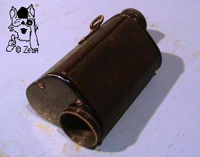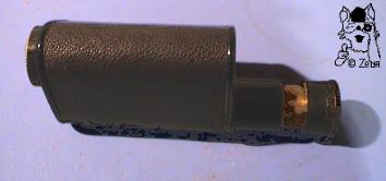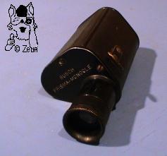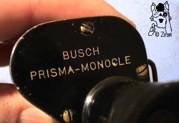 | Dieses wahrscheinlich vom Anfang des 20 Jh. stammende Busch Rathenow Monokular trägt lediglich die Bezeichnung "BUSCH PRISMA-MONOCLE". Es ist aus schwarz lackiertem Messing und der dreickige Prismenkörper hat eine dunkelbraune Lederummantelung mit Naht sowie eine angeschraubte Trageöse. Die Augenmuschel ist ebenfalls aus Messing. Die Originalledertasche ist erhalten und hat eine Gürtelschlaufe und einen Druckknopfverschluß (Beschriftung innen: R&M, wahrscheinlich des Knopfherstellers). | This Busch Rathenow monocular probably dating from the beginning of the 20th century is only labelled "BUSCH PRISMA-MONOCLE". It is made of black painted brass; the triangular prism housing is covered with dark brown leather with a seam. It also has a screwed on lug. The eyecup is made of brass as well. The original leather case still exits. It has a belt loop and a press-stud – engraving inside "R&M", probably the press-stud manufacturer. |