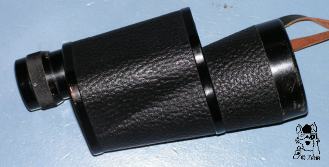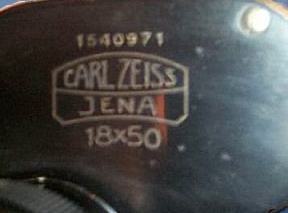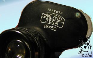 | Das Carl Zeiss 18x50 mit der Seriennummer 1677073 stammt aus dem 1934 oder 1935. Hierbei handelt es sich um ein Porro I-System im Vergleich zum Carl Zeiss 18x50 mit Porro II-System. Auch dieses Glas hat den typischen braunen Vorkriegs-Lederköcher mit eingeprägtem Carl-Zeiss-Logo und "Made in Germany" oben am Rand. | The Carl Zeiss Jena 18x50 monocular with the serial number 1677073 dating from 1934 or 1935 has a porro I-prism system in contrast to the Carl Zeiss 18x50 porro II monocular. This glass, too, comes with a typical brown leather case, having the Zeiss logo and "Made in Germany" stamped into the top rim of the case. |
