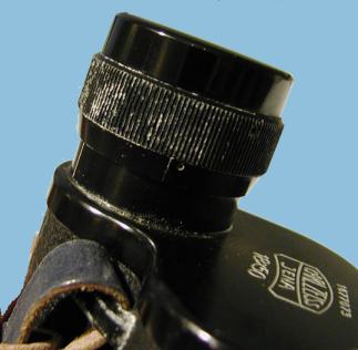 | Im Foto kann man erkennen, dass der geriffelte Fokussierungsteil des linksseitigen Okulars etwas korridiert ist. Die Dioptrienskala ist von -15 bis +15 eingezeichnet, aber, wie üblich nur mit +5 und -5 markiert. Die Deckel sind schwarz lackiert, der obere einfach, der untere dreifach verschraubt. Das Gehäuse und der konische Objektivtubus habe eine Rauhlackummantelung. | In the picture of the left-hand sided ocular you can see that the milled focussing ring has corroded a bit. The dioptre scale has division lines form -15 to +15, but as usual is only marked with -5, 0 and +5. The cover plates are lacquered black. The top cover has one screw, the bottom ocver three screws. The prism housing and the conical objective tube have a crinkle paint finish. |