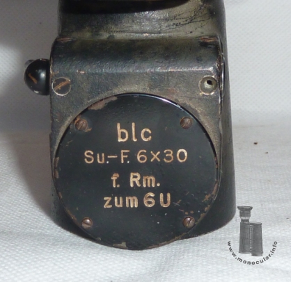 The 3rd model shown (Nr. 1440) is without coating. The last picture shows another inscription on the cover plate of monocular used with a 3 (?) meter stereo image rangefinder, also marked with Third Reich insignia. Another similar model, a director telescope (director = Richtmann) is marked "Rm.F. 6x30 zum 3R" and "Nr. 21". It has a reticle with a circle and cross-hairs within the circle. A specimen from WWII. is marked with the maker's code blc for Zeiss. |