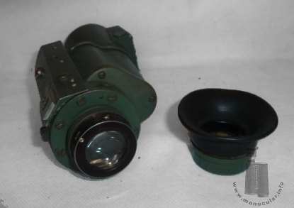 | Das 2. Modell mit Nr. 16 (mit unbekannter Abkürzung "f.A.O zum 4U") ist mit einer weißen "1" sowie "T" gekennzeichnet. Während die 1 vermutlich für das 1. Monokular der zwei am Em befindlichen steht, bedeutet das "T", dass das Monokular mit dem T-Belag vergütet ist (grünlich-gelber bis blauer Schimmer). Man erkennt die abnehmbare durch eine Kette gesicherte Weichgummiaugenmuschel. Dies ist mit dem Zeiss Punktualzeichen (verschlungenes CZ) versehen. Die Dioptrienskala ist mit + und - und evtl. einst phosphorisierenden tropfenförmigen Markierungen gekennzeichnet. Am Sockel des 6x30 befindet sich eine Produktionsnummer "131606" (das 3. Modell hat die Produktionsnummer ("81111"). Das Okular hat eine Strichplatte mit einem zentralen Kreis zum genauen Anvisieren. Welche Funktion der dickere Ring zwischen Okular und Gehäuse hatte, lässt sich nur vermuten: evtl. für eine Beleuchtungseinheit oder zum Drehen bzw. Justieren der Strichplatte. | The second model with number 16 (the meaning for the abbreviation "F.A.O zum 4U" is unknown) is inscribed with a white 1 and a T. The "1" probably stands for the piece number of the two monoculars attached to the rangefinder, and the "T" says that this monocular has coated optic (greenish-yellow and blue tint). The detachable soft rubber eyecup is in place and its mounting ring is secured with a little chain. The rubber is marked with the interwoven "CZ" letters, the Zeiss "Punktual" emblem. The dioptre scale is inscribed with plus and minus and several tear drop shaped markings which probably once were fluorescing due to phosphor inlays. The base has a stamped in production number ("81111"). The eyepiece has a built-in reticle with a central circle for a better targeting. The function of the thick ring part between the ocular part and the housing is uncertain, maybe for attaching an illumination unit or turning and adjusting the reticle. |