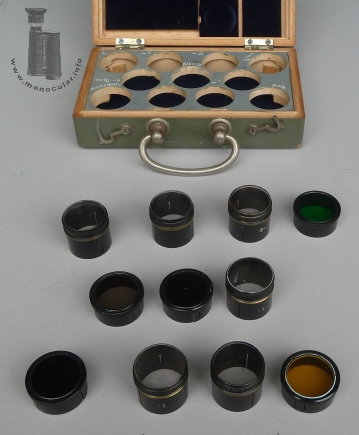 In one collection there are two different small cases with slip-on lenses (see photos). The glass weighs 530g. Its overall length is 15cm without and 15.5cm with slipped -on lenses. The housing is 52x52mm at its top and 62x62mm wide at its bottom . The 41mm long objective tube is 39mm, the 26mm long mounting tube is 35mm in diameter. |