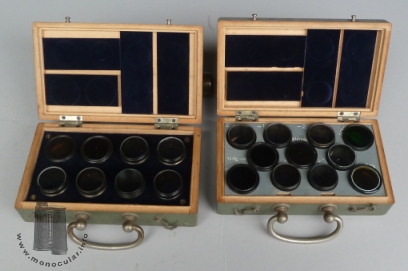 | Aus einer Sammlung liegen zwei Kästen mit den entsprechenden Aufstecklinsen und -filtern vor (s. Fotos). Das Glas wiegt 530g, hat eine Gesamtlänge von 15cm ohne und 15,5cm mit Aufstecklinsen. Es ist am oberen Gehäuse 52x52mm und unten 62x62mm breit. Der 41mm lange Objektivtubs ist 39mm, der 26mm lange Montagestutzen ist 35mm im Durchmesser. |