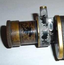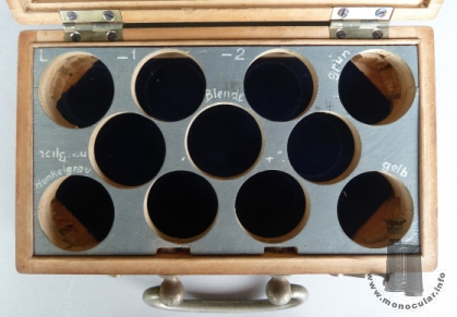 | Das Objektiv mit einem 3cm langen und im Durchmesser 4cm breiten Tubus hat einen hinten eingeschraubten und ins Prismengehäuse reichenden kegelförmigen Tubus, welcher ein zweite konvex-konkave 20mm Okularlinse trägt (Dialytisches Prinzip). Das Okularstück besteht aus verschiedenen Bauteilen: zum Deckel hin befindet ein Stück (31mm Durchmesser) mit Beleuchtungsfenster für die Strichplatte sowie ein 38mm dicker Ringteil mit einem kegelförmigen Griff (?) mit unbekannten Zweck (am oberen Ende ist eine Schraube --> Trockenlegungsventil ?). In dem Ringteil ist ein zweilinsiger Okulartubus (29mm Durchmesser) eingeschraubt. Auf dieses Okularstück können verschiedene Diopterlinsen - eingefasst in einer Hülse (30mm Durchmesser) - sowie Filter und eine Lochblende (32mm Durchmesser) gesteckt werden. Das Okular hat keinen Dioptrienausgleich, sondern die Fokussierung geschieht durch die unterchiedlichen Aufstecklinsen und deren Justierung auf dem Okularstück. |