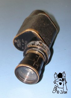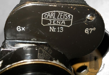 | Dieses 6x30 Monokular mit Beschriftung "Carl Zeiss Jena" im Linsenlogo, darunter "6x", ein Karo (♦) und "6,7°" (Angabe des Sehfelds) sowie einer größer geschriebenen "Nr. 130". Da es nur die Vergrößerungsangabe trägt, müsste es aus der Zeit um den 1. WK stammen. Eine Angabe des Sehfeldes ist jedoch eher ungewöhnlich - vielleicht für das Militär wichtig gewesen - und die Nummer lässt es auch nicht einordnen. Weitere Exemplare haben Nr. 13, 50, 175. Während bei dem Modell Nr. 13 die Beschriftung wie bei einem Fernglas auf dem Deckel angeordnet ist, haben die "Karo"-Modellen die Beschriftung um 90° gedreht auf dem Deckel, so dass sie bei einer Benutzung am weiteren Gerät lesegerecht steht. Das mit Hartgummi ummantelte Messing/Aluminium-Monokular mit schwarz lackierten Deckeln (3fach verschraubt) hat bei NR. 130 ein nachträglich ersetztes Okularstück und keine Montagehalterung; bei den anderen Exemplaren ist eine spezielles Okular im Original erhalöten und seitlich am Gehäuse eine runde Montageplatte bzw. -rohr angebracht, was darauf hinweist, dass es für einen bestimmten Zweck, wie z.B. als Richtfernrohr (vgl. 6x30 Richtfernrohr, verwendet wurde. |