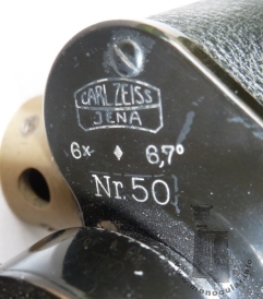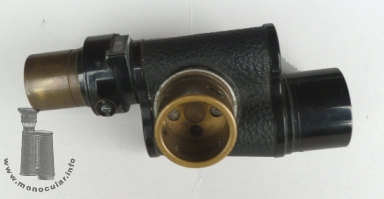 This 6x30 monocular is marked "Carl Zeiss Jena" in the Zeiss lens logo, below that "6x", a diamond (♦) and "6.7°" (field of view) and furthermore in bigger letters "Nr. 130". As there is only the magnification given (not the objective diameter) it should date around WWI. Stating the f.o.v. is quite uncommon - probably rather of importance to military units - it cannot be categorized by its number either. Other specimen have Nr. 13, 50, 175. While the markings on model nr. 13 are positioned like on usual binoculars, , the "dimond" marked models have cover inscriptions rotated by 90° so that they can be read when attached to the coresponding device. The ebonite covered brass and aluminium monocular has black painted cover paltes (3 screws). Number 130 was refurbished later with a aluminium eyepiece part. The other models have a special eyepiece (original) and a round mounting plate or tube attached to the housing which hints that these sights were part of a direction finder (cf. the6x30 Richtfernrohr) or some similar aiming instrument. |