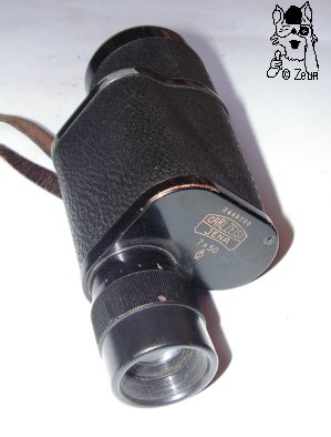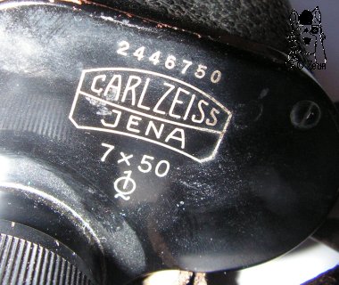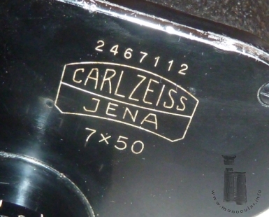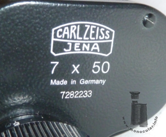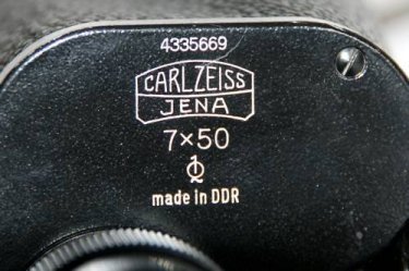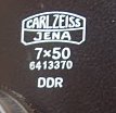 | Die Carl Zeiss 7x50 "Binoctarmos" - Nachfolger des 7x50-Vorkriegsmodells - stammen DDR-Produktion, was sich auch an dem 1Q-Zeichen erkennen lässt. Das Modell mit der Seriennummer 2446750 und 1Q-Zeichen (Bild 1) ist von 1949/50, das Modell mit der Seriennummer 2467112 von 1951, aber ohne 1Q-Zeichen, ferner Seriennummer 4335669 bereits von 1975, das Modell 6413370 von 1986, das mit Nr. 7282233 (Bild 2) ist bereits nach der deutschen Wiederverinigung in 1991 hergestellt worden; kurz danach wurde das 7x50 von Docter Optic in den 1990er noch einige Zeit gefertigt. |