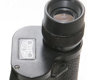 | Die abgebildete Binoctarmo-Deckel tragen das DDR-Qualitätszeichen "1Q", andere spätere Modelle sind auch mit "made in DDR" oder "DDR" gekennzeichnet, das späte aus der Wendezeit ist mit "Made in Germany" gekennzeichnet und die "7 x 50" mit Abständen versehen, um bündig unter das Logo zu passen (vgl. Docter-Modell). Es dürfte auch Exemplare mit der Exportkennzeichnung "(aus) Jena" geben. In einem weitern Foto ist ein 7x50-Gehäusedeckel abgebildet, der ein erhabenes Zeiss-Logo, aber keinen anderen Kennzeichnungen hat; die magenta Mehrfachvergütung der Linse weist auf ein späten Produktionszeitraum hin, evtl. kurz nach der Wende (1990?). | The cover plates depicted here bear the GDR "1Q" sign, some later models are marked "Made in DDR" or "DDR", the model from the 1991 is inscribed "Made in Germany" and the "7 x 50" is spaced in order to fit justified under the Zeiss logo (cf. Docter model). There will also be some surviving export models with "aus Jena" or just "Jena" on the covers. Another picture shows a cover plate only a raised Carl Zeiss Jena logo; its magenta multi-coating hints to a late specimen, probably shortly after 1990. |
