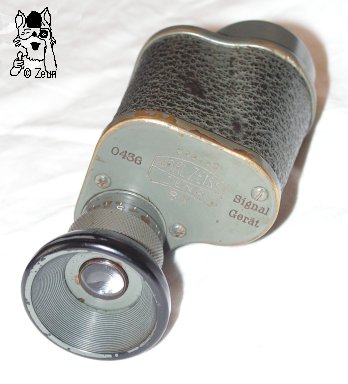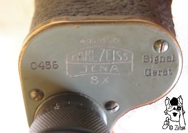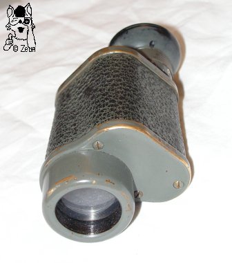 This 8x24 monocular was part of the Zeiss signaling apparatus (WWI). As it has no mounting feet like the cz6x24blink.htm or cz4x20.htm, it must have been for handheld use, thus also having a strap lug. For targeting it comes with across-hairs like the Carl Zeiss 8x24. The strucutred housing is painted with a greyish colour (vgl. Militärisches 8x24). The eyecup is made of brass covered with Bakelite. Its size is about those of the other 8x24 monoculars of that period. The military or device number is 0419 and 0436 for the pictured one, serial number is 642468 and 642468 (1916/17). |