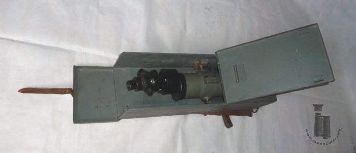 One surviving example is unmarked, but has a hard rubber covering on the top cover as well. Quite unusual, it comes with a spring lever stop for the eyepiece turret again. As one picture shows the Asem could not only be set up on a tripod but also on the Zeiss made table stand. A later 1939 Zeiss catalogue lets us assume that for a very short period a fourth design variant was issued by Zeiss, unless the catalogue drawing (detail of a sketch showing a sample of Zeiss observation telescopes) was not made according to the true design, or is supposed to represent the Asimara. The drawing shows that the Asem came with a yoke mount again (see second but last pic.). |