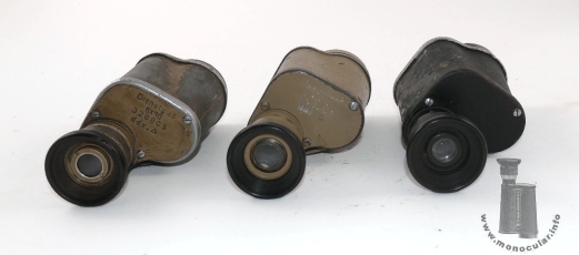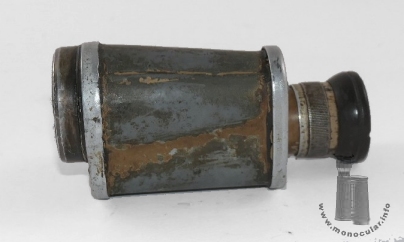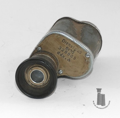 | Bei dem Monokular hier handelt es sich um ein monokulares Dienstglas (so gekennzeichnet) der deutschen Wehrmacht aus dem 2. Weltkrieg. Es trägt den Code "ddx" mit einem Punkt am Ende (ddx.), welcher für die Fa. Voigtländer & Söhne aus Braunschweig steht. Als Seriennummer ist 328805 sowie das Dreieckssymbol für temperaturbeständige Dichtungsfette zur Benutzung unter extremen Temperaturbedingungen eingeprägt. Das Trageband, soweit überhaupt Original, ist gerissen. Der Metallkörper und die Abdeckplatten sind teilweise noch bzw. waren sandfarben ('Dunkelgelb nach Muster') lackiert. Ein Exemplar mit Seriennummer 346825 sowie weitere bestätigen diese Merkmale. |