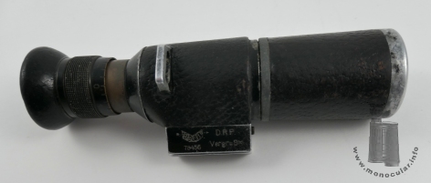 | Das vorliegende 8x26 Dialyt ist mit "Hensoldt Wetzlar" und dem Markennamen "Wacht" sowie "D.R.P. Vergr=8x" an den langen Außenseiten des Beschriftungssockels gekennzeichnet. Unter dem Logo steht die Seriennummer "78429". Die obere Sockelfläche ist unbeschriftet. Es hat ein Prismengehäuse mit eingegossener Trageriemenöse und dem vorstehenden Beschriftungssockel. Der Objektivtubus ist leicht konisch. Beide Tubusteile sind mit braunem Leder ummantelt. Ansonsten sind die Aluminium- und Messingteile sind schwarz lackiert. Das Messingokular hat eine umlaufende Dioptrienskala mit Beschriftungen bei null, +5 und -5. Die Augenmuschel ist aus Hartgummi. Ungewöhnlich ist ein zwischen Beschriftungssockel und Objektivtubus angebrachter Messingring. Da dieser Rillenspuren einer Abfeilung zeigt, könnte das Messingteil auch eine längere Halterung für ein anderes Instrument gewesen sein, die abgesägt wurde. Dafür spricht die Strichplatte mit Fadenkreuz. So könnte das Monokular als Visier oder Zieleinrichtung für ein Gewehr, Geschütz oder Peilgerät, wie einen Sextanten oder Theodoliten gedient haben. Ein anderes bekanntes Exemplar hat die Nummer 78449, was zumindest auf eine kleine - nicht öffentlich dokumentierte - Produktionsserie und bei Hensoldt gemachten Umbau dieser Art schließen lässt. Es entspricht ansonsten dem Reisedialyt 8x26. |