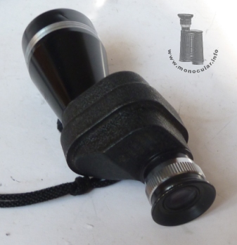 The "Eagle 10x30" model is a typical model in the design of a hosuing following the porro I prism shape inside. The larger model was made by Meiji Seiko Co. in Japan, which can also be proved by the catalgoue clip of a binocular version. So, the top cover is amrked with the logog and "MSC" as well as "Eagle 10x30 WIDE ANGLE" follwed below by its serial number 54448 in golden-yellow letters. The conical metal tube has a smooth black finish with a silver decoration ring at its end. The right-hand sided eyepiece also is completely made of metal, the focusing ring is blank, while the other elements ar painted black. The prism housing is covered with a textured anthracite lacquer anthraziten LAck ummantelt and comes with a strap lug. The optical elements are coated. |