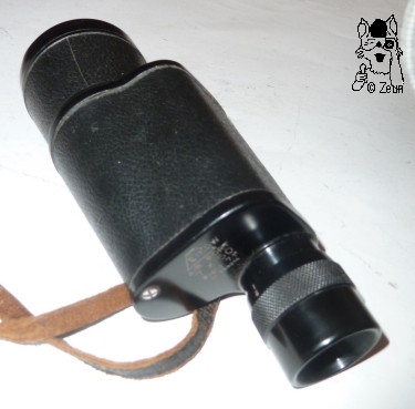 The 12x50 porro monocular was made with trademark EIKOW in Japan probably in the 1960s-70s. The company joint another and is now Mizar Optic in Japan. The optics are coated blue. It weighs 438g, is 177-181mm long, and measures 61x61mm at the top of the housing and 71x71mm at the bottom. The objective tube is 61mm, the ocular piece is 31mm, the focusing ring is 36mm and the eyecup 34mm in diameter. The dioptre scale at the right-hand sided ocular ranges from +2 to -4. The cover plates have one screw. The top one is marked "EIKOW Air Port 7x50 Field 7.1° No. 339214" and has the Eikow prism logo, a 90° outlined 3D prism. |