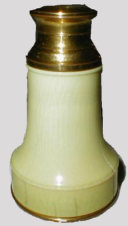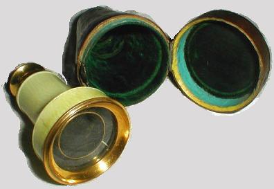 Another ivory-covered brass spy glass can be seen in the following photgraphs. According to the seller it is 7.5cm long, the diameter is 5cm at the objective end and 2.5 cm at the ocular end. The case is made of leather. Again, this glass dates from the 19. c. |