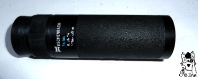 | Dieses Schmidt-Pechan-Monokular von Eschenbach trägt wie das Vorgängermodell die Bezeichnung "Farlux", hat ebenfalls ein Sehfeld von 8,3° bzw. 149m/1000m, aber hat einen geraden mit Hartgummi ummantelten Tubus mit einer Trageriemenöse. Es ist blau vergütet. Zwischen dem Tubus und der Weichgummiaugenmuschel ist ein Drehring, der zum Fokussieren die Okularlinse verschiebt. | This Schmidt-Pechan prism monocular by Eschenbach is also named "Farlux" like its predecessor, and also has a field of view of 8.3° or 149m/1000m, but comes with a straight tube covered with hard rubber. The tube has a strap lug. The optics are coated blue. Between the tube and the soft rubber eyecup is a ring to focus by moving the ocular lens system. |