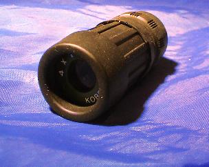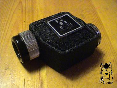 This rangefidner comes with a built-in 4x12 monocular (s. arrow). Using some rubber covering of an old pocket bincoular I covered the Korean made monocular, and put a foldable rubber eyecup to tthe ocualr piece. I cut down the rubber to an appropriate size and used some multipurpose glue to attach the rubber parts. |
