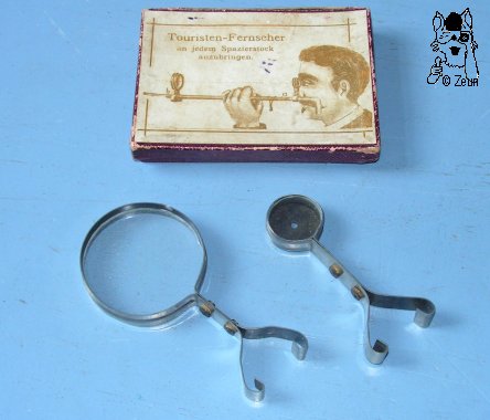 Portable TelevisonThis "Fernsehre" (= Television ~ televisor) dates from the 19th century. It is named "Tourist Telescope" on one box, on the other as a "Portable Pocket Telescope". The "Fernseher" cosnists of the two lenses needed for a Galilean system. These are attached to metal frames whereas the the metal handles are fixec by screws at the first model, and fixed with brass clamps at the second model. You can use the two lenses just like with the C-FAR by holding them in front of your eye, and then focus them. According to the isntructions it is rather meant to attach them to a walking cane with the clamp-shaped handles. You can then move them for focusing like on an optical bench while holding the cane to your eye, So one can have it in the pocket when walking or hiking and is quickly at hand.The small ocular lens also has a diaphragm. It has a 23nn, its frame a 27mm diameter, being 11mm thick. Overall length with the handle is 79mm. The objective lens measures 57mm, the frame 60mm in daimeter. The frame is also 11mm in thickness. OVerall length is 10cm. The ocular lens frame weihgs 16g, the objective length weighs 33g; both together with the box weihg about 79g. |