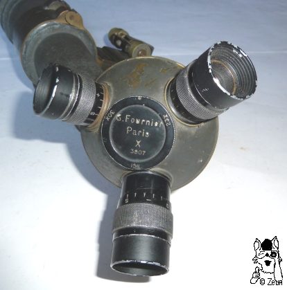 G. Fournier 15x 23x 30x Telescope with ocular revolverThis Fournier telscope with a triple ocular revolver is identical to the 'Krauss 15x 25x 30x'. So its specifications are the same, too. The Roman number "X" hints at type 10 of the "Longue-vue Monoculaire de Prismes" (Monocular Prism-Telescope) described by the "Ministère de la Guerre" (War Office).Serial number at the revolver is 3876. A 517 is stamped into the brass rack (at the mounting barrel part) followed by the serial number. Each eyepiece has its own dioptre adjustment and eyecup. The latter are made of plastic or made of metal on model 3807. The 3807 telescope comes with the usual E. KRauss tripod adapter with adjustment knobs. |