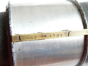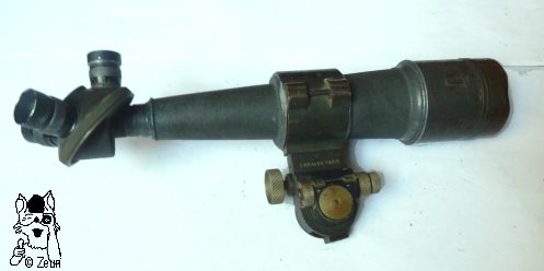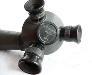 G. Fournier 15x 23x 30x Teleskop mit OkularrevolverDas bei hier abgebildete Fournier Teleskop mit dreifach Okularrevolver und Seriennummer 3876 ist identisch mit dem 'Krauss 15x 25x 30x' und hat somit auch die gleichen Spezifikationen. Die römische Ziffer "X" weist auf den Typ 10 des "Longue-vue Monoculaire de Prismes" (Monokulares Prisnmenfernrohr) des "Ministère de la Guerre" (Kriegsministerium) hin.Auch hier hat jedes Okular seinen eigenen Dioptrienausgleich; die Augenmuscheln sind aus Kunststoff, beium 2. Modell (Sn. 3807) aus Metall. Die eingestempelte Nummer am Befestigungstubus ist 517, gefolgt von der Seriennummer. Das 3807er Modell hat die übliche Stativbefestigung mit Stellrädern von E. Krauss Paris. |
