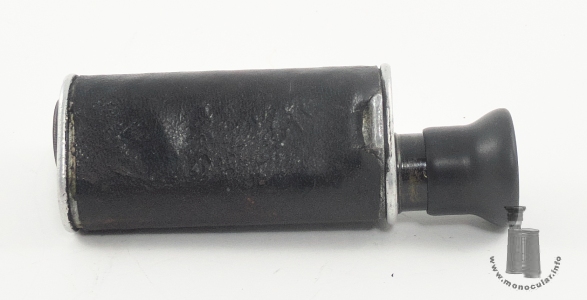 The monocular shown here is marked with the company's name "C. P. Goerz Berlin" in a floral Art Noveau script at the top cover, and with its serial number 53960 - 1903/04 - at the bottom cover (both fixed with 3 screws). The leather covering is stamped with "12x", so this is a 12x20 (actually a 12x21) glass weighing 204g. The prism housing measures 4.5 x 4.5 x 9.2cm – overall length is 126 - 134 mm. The design of the body is triangular. It has a cast-in strap lug and there is a Bakelite eye-cup with a dioptre scale (+/-2) without numbers. Another specimen with the serial number 143602 - c. 1908 - and block letters on the top cover now comes with brass cover plates and weighs 252g. Its matching case is marked with some British officer's initials ("Capt. A.J.H. Iles B.A.M.C."). |