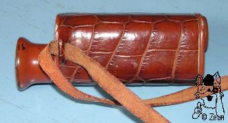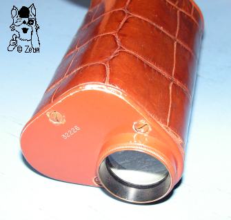 | Ein Exemplar in "Schmuckausführung" mit braunem Krokodillederummantelung und passender brauner Lackierung der Deckel und Augenmuschel hat ebenfalls eine weißliche Druckschrift-Gravierung. Die Seriennummer am unteren Deckel lautet 32226; Produktionszeit 1902. | A 12x20 luxury model with a brown corcodile leather covering and matching brown lacquering on the cover plates also comes with block lettering. The lower cover plate is marked with serial number 32226; date 1902. |