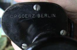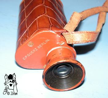 | Das abgebildete Monokular hat die Firmenbezeichnung "C. P. Goerz Berlin" in floraler Jugendstil-Schrift am oberen Deckel und die Seriennummer 53960 - 1903/04 - am unteren Deckel (beide 3fach verschraubt). Die Lederummantelung ist mit "12x" gestempelt, so dass es sich um ein 12x20 (tatsächlich 12x21) Glas handelt. Es wiegt 204g. Das Prismengehäuse ist 4,5 x 4,5 x 9,2cm groß bei einer Gesamtlänge von ca. 126 - 134 mm. Das Gehäuse ist dreieckig geschnitten, hat eine eingegossene Riemenöse und eine Bakelitaugenmuschel mit unbeschriftete Dioptrienskala (+/-2). Ein weiteres Exemplar mit Seriennummer 143602 - ca. 1908 - und Druckschrift am oberen Deckel hat nunmehr Messingdeckel und wiegt 252g. Der zugehörige Köcher trägt die Initialien eines britischen Offiziers ("Capt. A.J.H. Iles B.A.M.C."). |