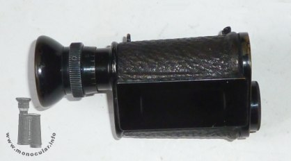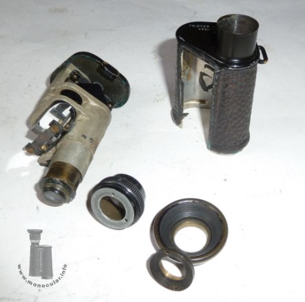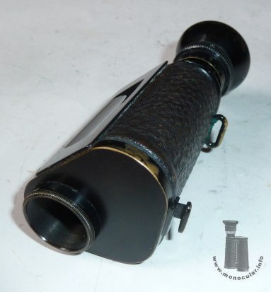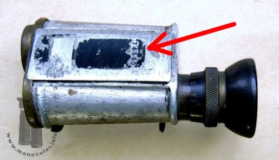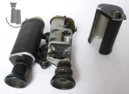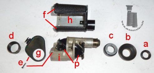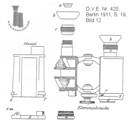 | Dieses Goerz 6x20 Monokular ist die seltene Variante des so genannten "Mantelglases" (D.F. 03, s. Bild 10). Die Bezeichnung rührt daher, dass sich der Gehäuse-Mantel (f) recht schnell abnehmen lässt, um im Inneren die beiden (Porro 1) Prismen (p) zu säubern oder ggf. zu justieren (s. Teil der Skizze aus: D.V.E. Nr. 420, Berlin 1911, S. 19, Bild 12. dort). Dafür wird die Verschraubung (Okularmutter a) um die Okularlinse in der Augenmuschel (b) gelöst, so dass sich zunächst die Augenmuschel, dann das Okularstück mit dem Fokussierungs- und Dioptrienring abziehen lässt (c). Löst man seitlich am unteren Deckel (g) eine Schraube (e), kann man nun über eine Wulst (f) das gesamte Alu-Gehäuse (h) mit der strukturierten Vulkanitummantelung zum Okularende hin abnehmen. Das innere Aluminiumgerüst mit den Prismenstühlen sowie eine seitliche Haltewand bleibt bestehen (i). Die seitliche Haltewand ist außen schwarz lackiert und hat eine rechteckige Mulde, in die sich zum sicheren Halten des Monokulars z.B. gut der Daumen legen lässt. Beim Binocle befindet sich an dieser Seite oben und unten die Stege der Fernglasbrücke sowie oft eine Seriennummer, wie auch ein halbiertes Fernglasexemplar zeigt (Bilder 9-10). | This Goerz 6x20 monocular is a rare variant of the so-called "Mantelglas" (see pic. 10). The named was coined after the casing of the housing (Mantel = mantle/coat/jacket) (f) which can be dismantled rather quickly in order to clean the inside or adjust the two (Porro 1) prisms (p) (cf. part of the drawing in: D.V.E. Nr. 420, Berlin 1911, p. 19, fig. 12. therein). You can do that by unscrewing the retainer ring (ocular nut a) in the eyecup end (b) enclosing the ocular lens so that you can pull off first the eyecup, then the ocular tube with its focusing and dioptre ring (c). When you loosen the screw (e) on the side of the bottom cover (g), you then can take off the complete textured Ebonite covered aluminium housing (h) over a bulge (f) towards the eyepiece end. The inner aluminium rack including the prism chairs as well as a side wall (i) remain as one piece. The side wall is lacquered black on the outside and has a rectangular hutch, in which you can press the thumb for firmly holding the monocular. On this side the binocular version has its two bridge arms and is often marked with the serial number there a seen on a binocular half (pictures 9-10). |